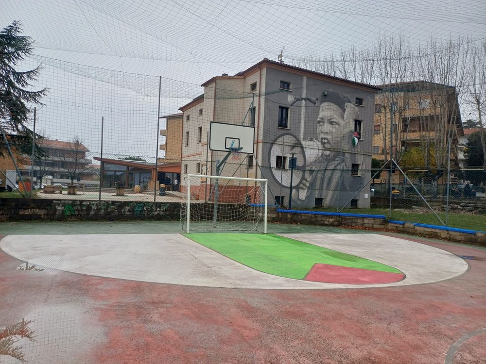 Due immagini: un campetto con le aree bianche del calcio e le zone del basket verdi (come si vede in foto); un giornale che dichiara oggi stesso che quello stesso campetto ha le bandiere della Palestina. Il Resto del Carlino e il giornalista Asterio Tubaldi che firma l’articolo uscito oggi, venerdì 5 dicembre 2025, ci portano un esempio di informazione senza fonti, senza rapporto con la realtà.